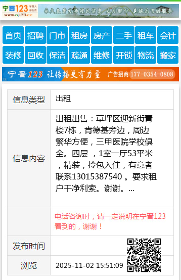 出租出售:草坪区迎新街青楼7栋,肯德基旁边,周边繁华方便,三甲医院学校俱全。四层 ,1室一厅53平米,精装,拎包入住,有意者联系13015387540 。要求租户干净利索。谢谢。 【电话咨询时,请一定说明在太原生活网看到的,谢谢!】 |