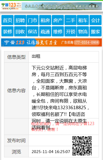 下元公交站附近,高层电梯房,每月三百到五百元不等,全阳面家,大飘窗,大凉台,不是隔断房,房东直租,长期租住的可以享受水电暖全包,房间有限,欲租从速!!尽快来电13233618825,领取福利名额了!! 【电话咨询时,请一定说明在太原生活网看到的,谢谢!】 |