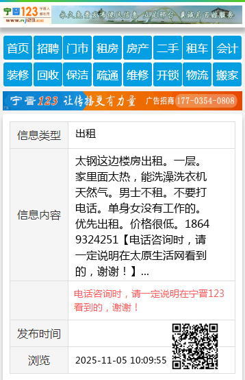 太钢这边楼房出租。一层。家里面太热,能洗澡洗衣机天然气。男士不租。不要打电话。单身女没有工作的。优先出租。价格很低。18649324251 【电话咨询时,请一定说明在太原生活网看到的,谢谢!】 |