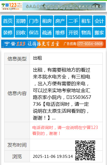 出租,有需要租地方的看过来本院水电齐全,有三相电,出入方便有需要的来电,可以过来实地考察地址金汇路农家小院内,☎15503657736 【电话咨询时,请一定说明在太原生活网看到的,谢谢!】 |