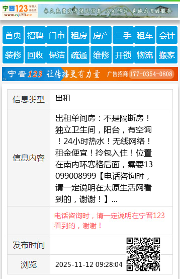 出租单间房:不是隔断房!独立卫生间,阳台,有空调!24小时热水!无线网络!租金便宜!拎包入住!位置在南内环赛格后面,需要13099008999 【电话咨询时,请一定说明在太原生活网看到的,谢谢!】 |