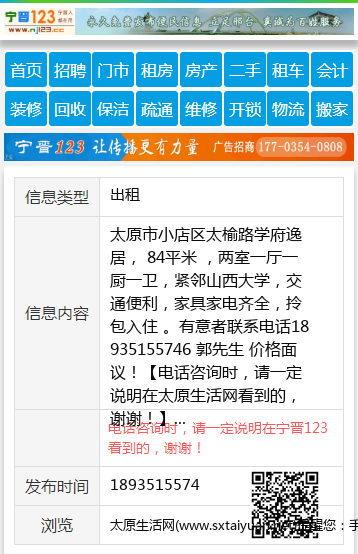 太原市小店区太榆路学府逸居, 84平米 ,两室一厅一厨一卫,紧邻山西大学,交通便利,家具家电齐全,拎包入住 。有意者联系电话18935155746 郭先生 价格面议! 【电话咨询时,请一定说明在太原生活网看到的,谢谢!】 |