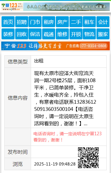 现有太原市迎泽大街窊流天润一期2号楼25层,面积108平米,已简单装修。干净卫生,水暖电齐全,拎包入住,有意者电话联系13283612509