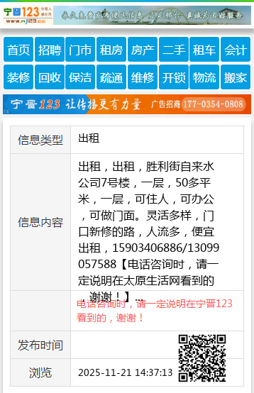出租,出租,胜利街自来水公司7号楼,一层,50多平米,一层,可住人,可办公,可做门面。灵活多样,门口新修的路,人流多,便宜出租,15903406886/13099057588 【电话咨询时,请一定说明在太原生活网看到的,谢谢!】 |