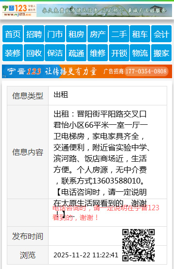 出租:晋阳街平阳路交叉口君怡小区66平米一室一厅一卫电梯房,家电家具齐全,交通便利,附近省实验中学、滨河路、饭店商场近,生活方便。个人房源,无中介费,联系方式13603588010。 【电话咨询时,请一定说明在太原生活网看到的,谢谢!】 |