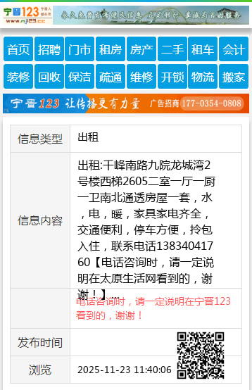 出租:千峰南路九院龙城湾2号楼西梯2605二室一厅一厨一卫南北通透房屋一套,水,电,暖,家具家电齐全,交通便利,停车方便,拎包入住,联系电话13834041760 【电话咨询时,请一定说明在太原生活网看到的,谢谢!】 |