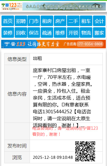 庞家寨村口房屋出租,一室一厅,70平米左右,水电暖,空调,热水器,全屋家具。一应俱全,拎包入住。租金亲民,生活成本低,适合预算有限的你。有意者联系电话13015444252 【电话咨询时,请一定说明在太原生活网看到的,谢谢!】 |