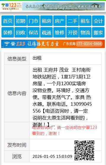 出租 王府井 茂业 王村南街地铁站附近,1室1厅1厨1卫房屋,一个月1200实墙房 没物业费。环境好,交通方便。带着天然气了。家具 热水器。