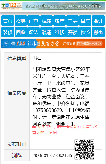 出租煤监局大营盘小区92平米住房一套,大红本,三室一厅一卫,水暖电气、家具齐全,拎包入住,院内可停车,无物业费,租金面议,长租优惠,中介勿扰,电话13753698629。 【电话咨询时,请一定说明在太原生活网看到的,谢谢!】 |