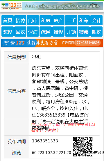 房东直租,双塔西街体育馆附近有单间出租,阳面家,紧邻地铁二号线,公交总站,省人民医院,省中研,柳巷商业街,迎泽公园,交通便利,每月房租300元,水,电,暖齐全,拎包入住,电话13633513339