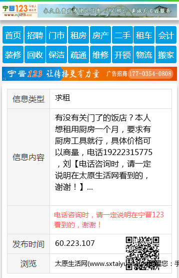 有没有关门了的饭店?本人想租用厨房一个月,要求有厨房工具就行,具体价格可以商量,电话19222315775,刘 【电话咨询时,请一定说明在太原生活网看到的,谢谢!】 |