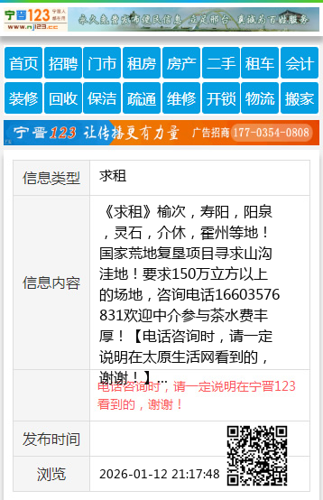 《求租》榆次,寿阳,阳泉,灵石,介休,霍州等地!国家荒地复垦项目寻求山沟洼地!要求150万立方以上的场地,咨询电话16603576831