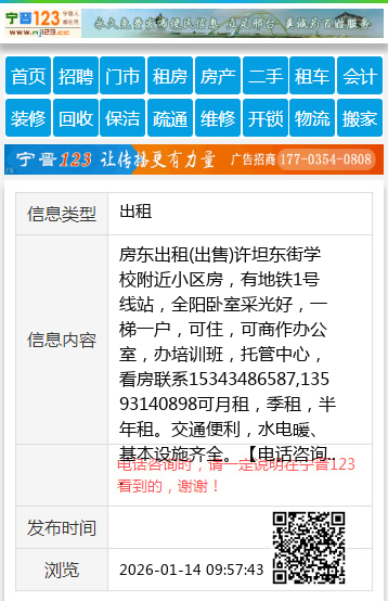 房东出租(出售)许坦东街学校附近小区房,有地铁1号线站,全阳卧室采光好,一梯一户,可住,可商作办公室,办培训班,托管中心,看房联系15343486587,13593140898可月租,季租,半年租。交通便利,水电暖、基本设施齐全。 【电话咨询时,请一定说明在太原生活网看到的,谢谢!】 |