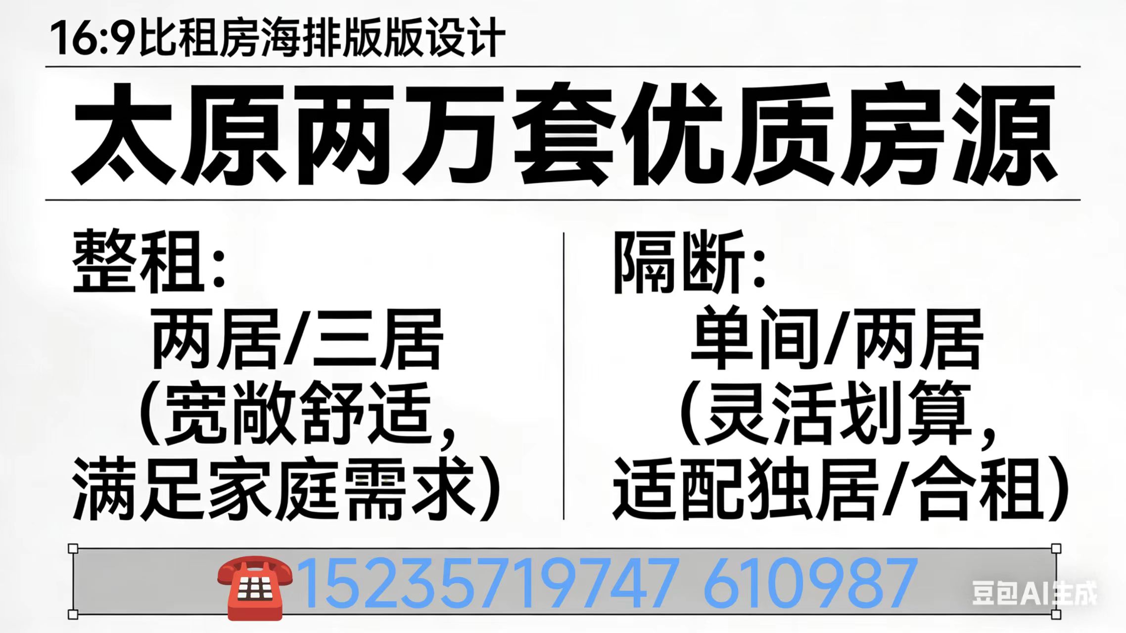 太原五大城区优质房源,可短租月付,性价比高,精装修,付款方式灵活。 【电话咨询时,请一定说明在太原生活网看到的,谢谢!】 |