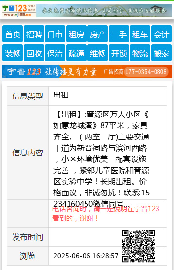 【出租】:晋源区万人小区《如意龙城湾》87平米,家具齐全。(两室一厅)主要交通干道为新晋祠路与滨河西路,小区环境优美 配套设施完善 ,紧邻儿童医院和晋源区实验中学!长期出租。价格面议,非诚勿扰!联系:15234160450微信同号 【电话咨询时,请一定说明在太原生活网看到的,谢谢!】 |