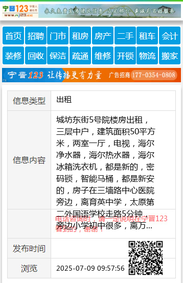 城坊东街5号院楼房出租,三层中户,建筑面积50平方米,两室一厅,电视,海尔净水器,海尔热水器,海尔冰箱洗衣机,都是新的,密码锁,智能马桶,都是新安的,房子在三墙路中心医院旁边,离育英中学,太原第二外国语学校走路5分钟,旁边小学初中很多,离万达柳巷也很近,本房一直空置着,要求租房的爱惜房子,爱惜各种电器,家里喜欢干净整洁的,不能吸烟的