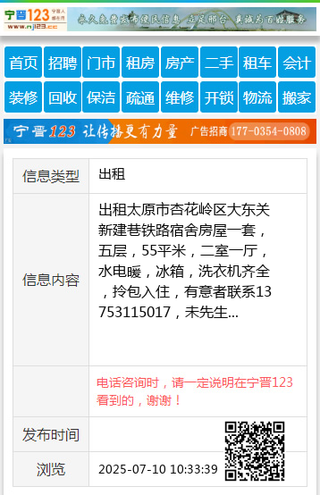 出租太原市杏花岭区大东关新建巷铁路宿舍房屋一套,五层,55平米,二室一厅,水电暖,冰箱,洗衣机齐全,拎包入住,有意者联系13753115017,未先生 【电话咨询时,请一定说明在太原生活网看到的,谢谢!】 |