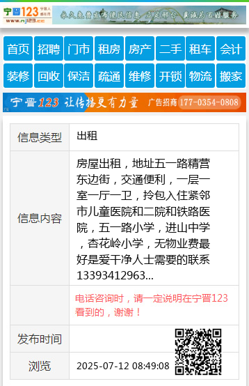 房屋出租,地址五一路精营东边街,交通便利,一层一室一厅一卫,拎包入住