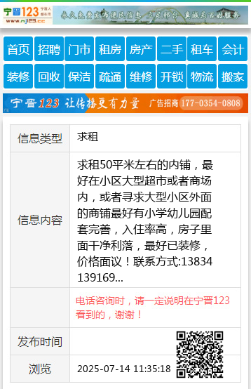 求租50平米左右的内铺,最好在小区大型超市或者商场内,或者寻求大型小区外面的商铺