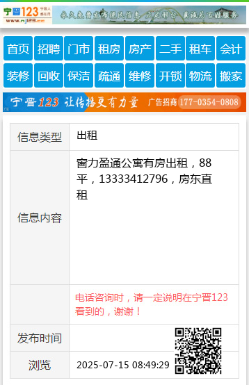 窗力盈通公寓有房出租,88平,13333412796,房东直租