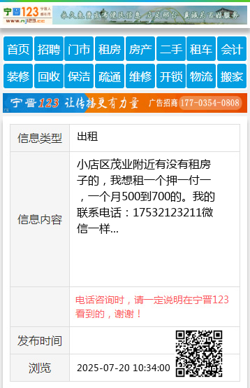小店区茂业附近有没有租房子的,我想租一个押一付一,一个月500到700的。我的联系电话:17532123211微信一样 【电话咨询时,请一定说明在太原生活网看到的,谢谢!】 |