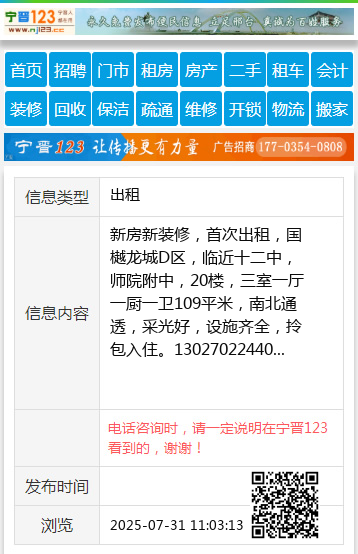 新房新装修,首次出租,国樾龙城D区,临近十二中,师院附中,20楼,三室一厅一厨一卫109平米,南北通透,采光好,设施齐全,拎包入住。13027022440 【电话咨询时,请一定说明在太原生活网看到的,谢谢!】 |
