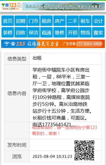 学府街中辐院车小区有房出租,一层,88平米,三室一厅一卫,地理位置优越
