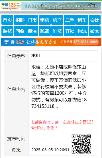 预算1200左右,中介勿扰,有房东可以加微信18734153118 【电话咨询时,请一定说明在太原生活网看到的,谢谢!】 |