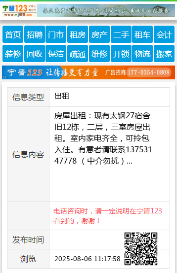 房屋出租:现有太钢27宿舍旧12栋,二层,三室房屋出租。室内家电齐全,可拎包入住。