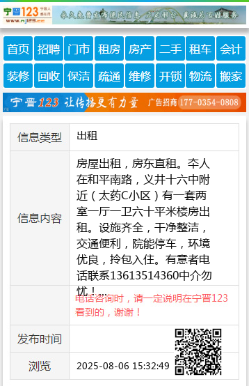 房屋出租,房东直租。夲人在和平南路,义井十六中附近(太药C小区)有一套两室一厅一卫六十平米楼房出租。设施齐全,干净整洁,交通便利,院能停车,环境优良,拎包入住。有意者电话联系13613514360中介勿忧! 【电话咨询时,请一定说明在太原生活网看到的,谢谢!】 |