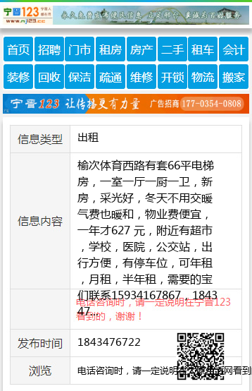 榆次体育西路有套66平电梯房,一室一厅一厨一卫,新房,采光好,冬天不用交暖气费也暖和,物业费便宜,一年才627 元,附近有超市,学校,医院,公交站,出行方便,有停车位,可年租,月租,半年租,需要的宝们联系15934167867,18434767226