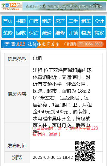 出租:位于双塔西街和南内环体育馆附近,交通便利,附近有实验小学,迎泽公园,医院,超市,面积为 18到20平米左右,1层到6层,每层都有,1室1厨 1 卫,月租金450元到500元,简装修,水电暖家具床齐全,拎包就可入住,可以月交。联系电话:13111000032韩先生,数量不多,先租先享受,欢迎光临 【电话咨询时,请一定说明在太原生活网看到的,谢谢!】 |
