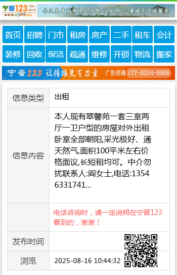 本人现有翠馨苑一套三室两厅一卫户型的房屋对外出租