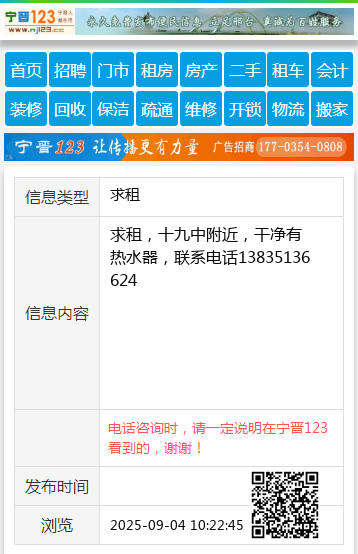求租,十九中附近,干净有热水器,联系电话13835136624