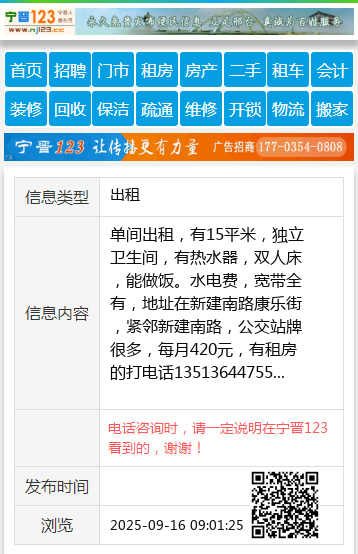 单间出租,有15平米,独立卫生间,有热水器,双人床,能做饭。水电费,宽带全有,地址在新建南路康乐街,紧邻新建南路,公交站牌很多,每月420元,有租房的打电话13513644755 【电话咨询时,请一定说明在太原生活网看到的,谢谢!】 |