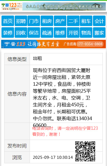 现有位于府西街国贸大厦附近一间房屋出租,紧邻太原12中学校,食品街,钟楼街等繁华地带,房屋面积25平米左右,水、电、空调,卫生间齐全,月租金450元,租金年付,长期租可优惠。中介勿扰。联系电话13403460600. 【电话咨询时,请一定说明在太原生活网看到的,谢谢!】 |
