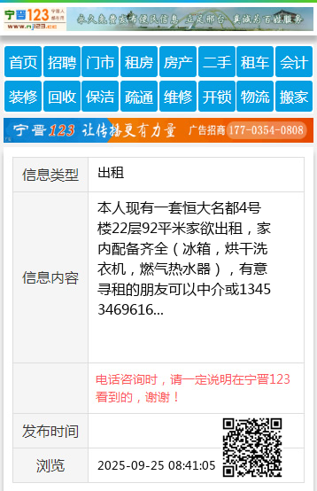 本人现有一套恒大名都4号楼22层92平米家欲出租,家内配备齐全(冰箱,烘干洗衣机,燃气热水器),有意寻租的朋友可以中介或13453469616 【电话咨询时,请一定说明在太原生活网看到的,谢谢!】 |
