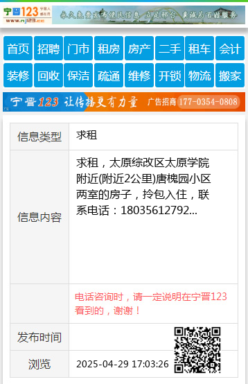 求租,太原综改区太原学院附近(附近2公里)唐槐园小区两室的房子,拎包入住,联系电话:18035612792 【电话咨询时,请一定说明在太原生活网看到的,谢谢!】 |