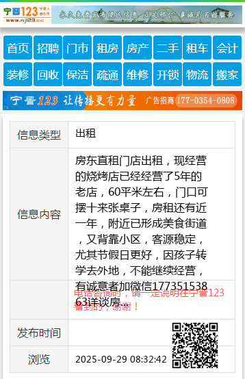 门店出租,现经营的烧烤店已经经营了5年的老店,60平米左右,门口可摆十来张桌子,房租还有近一年,附近已形成美食街道,又背靠小区,客源稳定,尤其节假日更好,因孩子转学去外地,不能继续经营,有诚意者加微信17735153863详谈